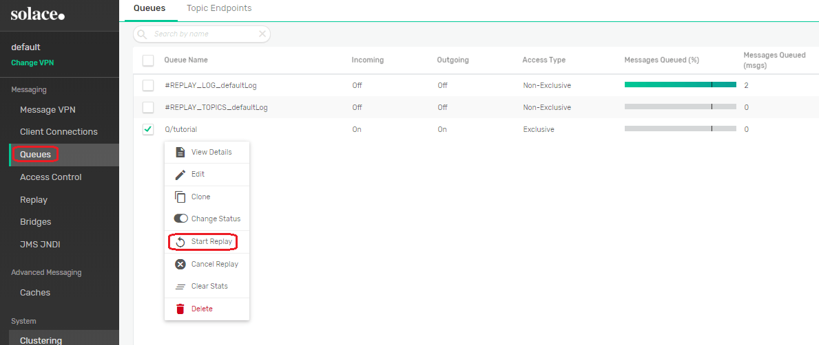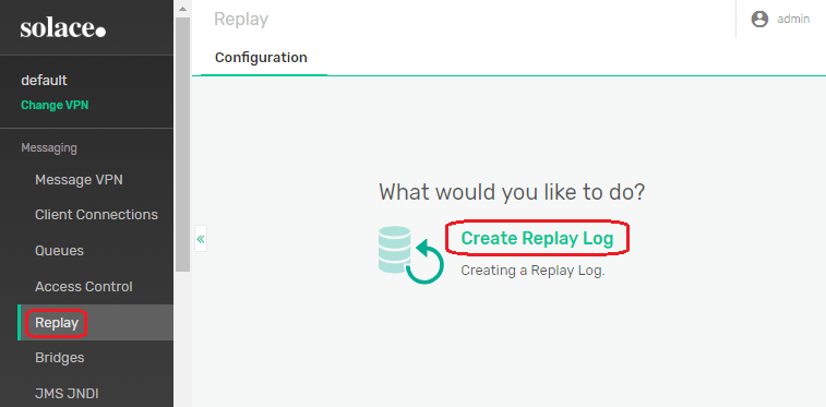 A replay log must be created on the message broker for the Message VPN using Message Replay CLI configuration or using Broker Manager administration console. Another option for configuration is to use the SEMP API.