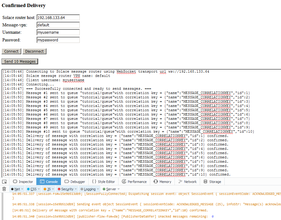 The following is a screenshot of the tutorial’s ConfirmedPublish.html web page with the JavaScript debug console open in the Firefox browser. It captures the page after it was loaded and the “Connect” button was clicked and then the “Consume messages” button was clicked.