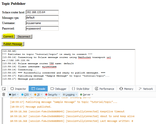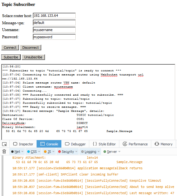 The following screenshots of the tutorial’s TopicPublisher.html and TopicSubscriber.html web pages with the JavaScript debug console open in the Firefox browser. It captures the pages after a message was published and received.