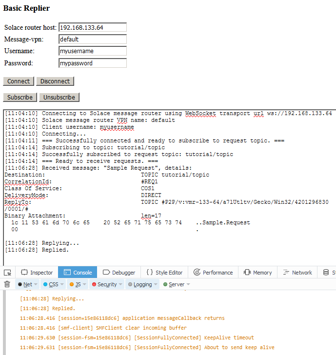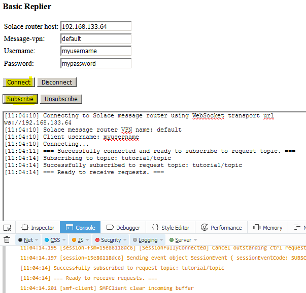 The following is a screenshot of the tutorial’s BasicReplier/BasicReplier.html web page with the JavaScript debug console open in the Firefox browser. It captures the page after it was loaded and the “Connect” button was clicked and then the “Subscribe” button was clicked.