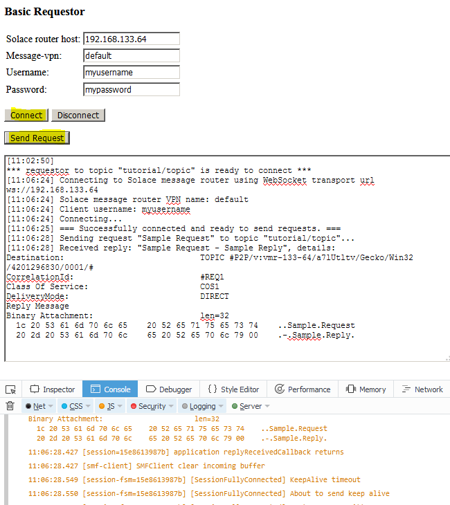 Now, open BasicRequestor/BasicRequestor.html page in the browser and connect to the same Solace message router as the BasicReplier specifying the router’s URL and clicking “Connect” button. Then send the request by clicking the “Send Request” button on the BasicRequestor/BasicRequestor.html page.